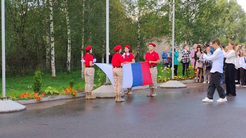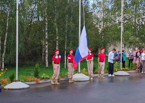 Торжественным маршем знаменная группа выносит флаг Российской Федерации. Все застыли на торжественной линейке под звуки гимна России. Право поднять флаг предоставлено ученице 9 класса Опря Злате. Всё наполнено торжеством и гордостью, что ты частичка этого действа, этого великого праздника Дня Знаний. Ведь знание – это будущее каждого из нас, это будущее страны. Торжественная линейка объявляется открытой.